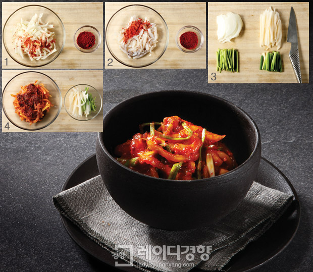 ¸¸µé±â 1 Äᳪ¹°Àº »Ñ¸®¸¸ »ì¦ ´Ùµë¾î ²ú´Â ¹°¿¡ ¼Ò±ÝÀ» ¾à°£ ³Ö°í À绡¸® µ¥Ä£ µÚ ³ÐÀº Á¢½Ã¿¡ ÆîÃļ ³ÃÀå°í¿¡ ³Ö¾î ½ÄÈù´Ù. 2 ¹Ì³ª¸®¿Í ÂÊÆÄ´Â 5cm ±æÀÌ·Î ½ä°í È«°íÃß´Â 3cm ±æÀÌ·Î °ö°Ô ä½ã´Ù. 3 ¨çÀÇ Äᳪ¹°¿¡ °íÃå°¡·ç¸¦ ³Ö°í »ì»ì ¹ö¹«¸° µÚ ¼Ò±ÝÀ» Á¦¿ÜÇÑ ³ª¸ÓÁö ºÐ·®ÀÇ ¾ç³ä Àç·á¸¦ ³Ö¾î ¹ö¹«¸°´Ù. 4 ¨é¿¡ ¨èÀÇ ¹Ì³ª¸®¿Í ÂÊÆÄ, È«°íÃ߸¦ ³Ö°í ¹ö¹«¸° µÚ ¼Ò±ÝÀ¸·Î °£ÇÑ´Ù.