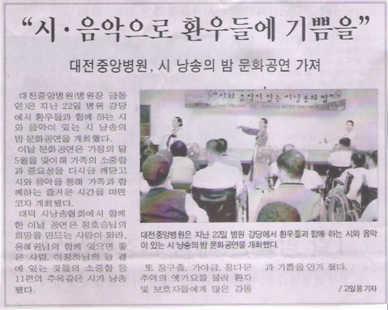 2007³â 5¿ù 22ÀÏ ¿ÀÈÄ 7½Ã ´ëÀü Áß¾Óº´¿ø °´ç¿¡¼ ȯ¿ìµéÀ» À§ÇÑ "½Ã¿Í À½¾ÇÀÌ ÀÖ´Â ½Ã³¶¼ÛÀÇ ¹ã"ÀÌ È¸Àå´ÔÀÇ µû½ºÇÑ ¿ÀÇÁ´× ¸àÆ®¸¦ ½ÃÀÛÀ¸·Î Á¶±¤ÀÚ ¹«¿ë´ÜÀÇ È·ÁÇÑ ¹«¿ëÀ¸·Î ¸·ÀÌ ¿Ã¶ú´ä´Ï´Ù.